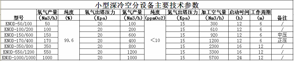小型深冷空分設備采用低壓流程,利用深度冷凍及精餾的方法從空氣中提取純氧和純氮,即利用透平膨脹機冷凍循環原理使空氣液化,根據液氧和液氮的沸點不同,在分餾塔內進行二次精餾,從而獲得99.6%純度的氧氣及99.99%以上純度的氮氣。根據需要,改變操作亦可制取部分液氧、液氮和醫用氧。